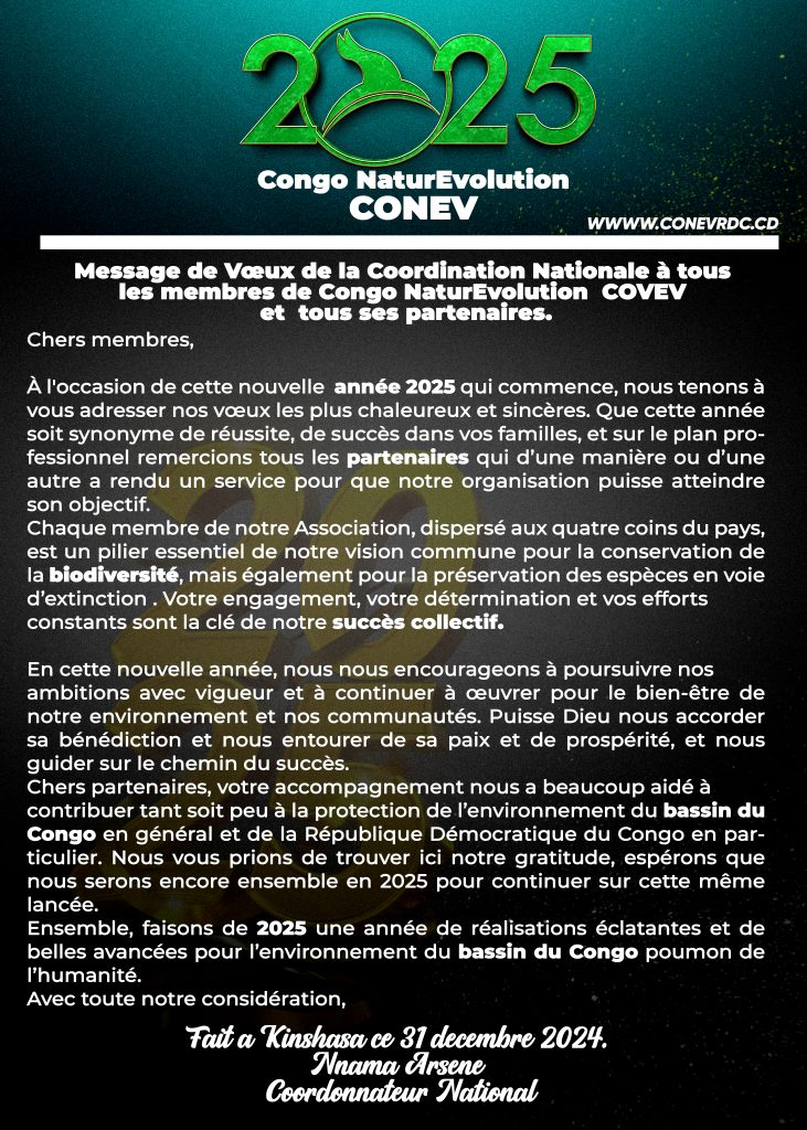 Message de Vœux de la Coordination Nationale à tous les membres de Congo NaturEvolution COVEV et tous ses partenaires.